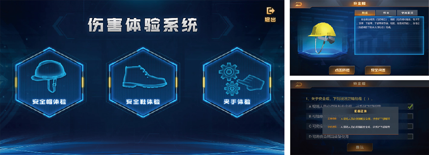 設(shè)備包含三大培訓(xùn)功能,分別是安全帽、安全鞋、機(jī)械夾傷,每種培訓(xùn)功能里又包含三種培訓(xùn)方式,分別是理論知識教育、安全知識考核、實體傷害體驗,進(jìn)行理論、考核、實體體驗三位一體綜合培訓(xùn)。